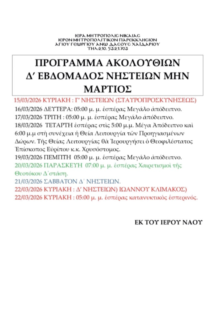 Λειτουργικό Πρόγραμμα Εδομάδας 22 ~ 29 Μαρτίου 2026