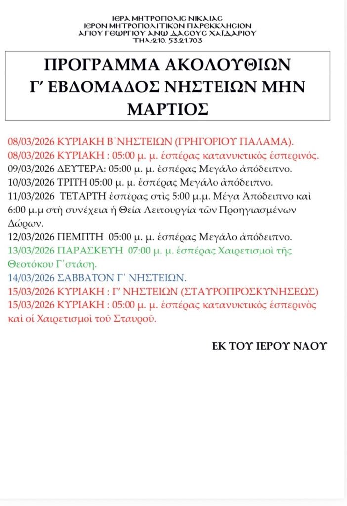 Λειτουργικό Πρόγραμμα Εβδομάδας 15 Μαρτίου ~ 22 Μαρτίου 2026
