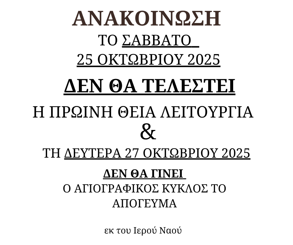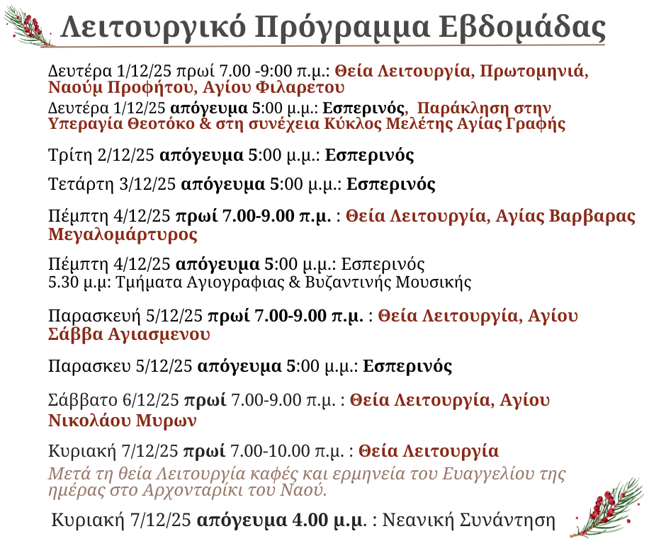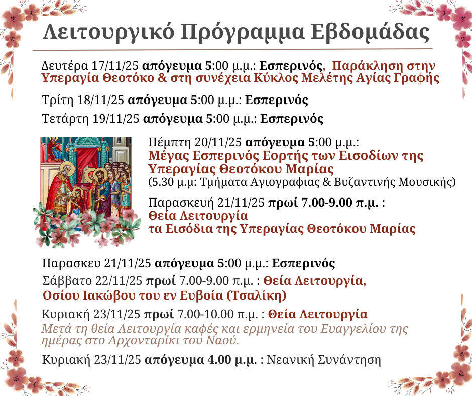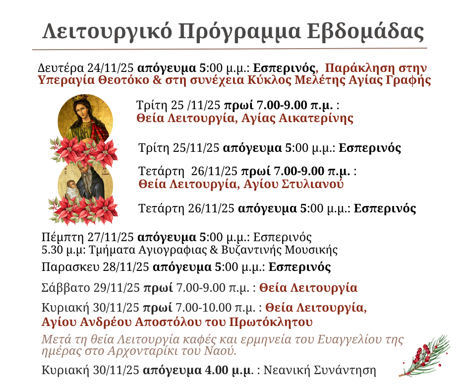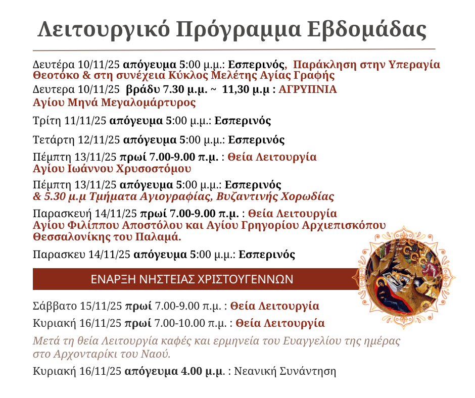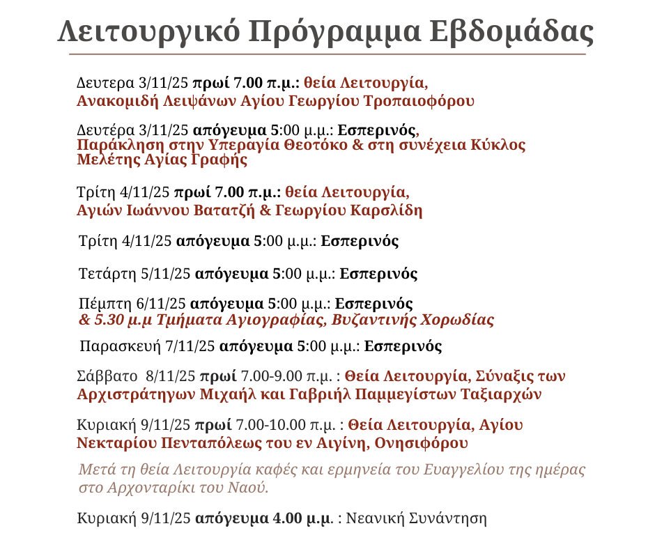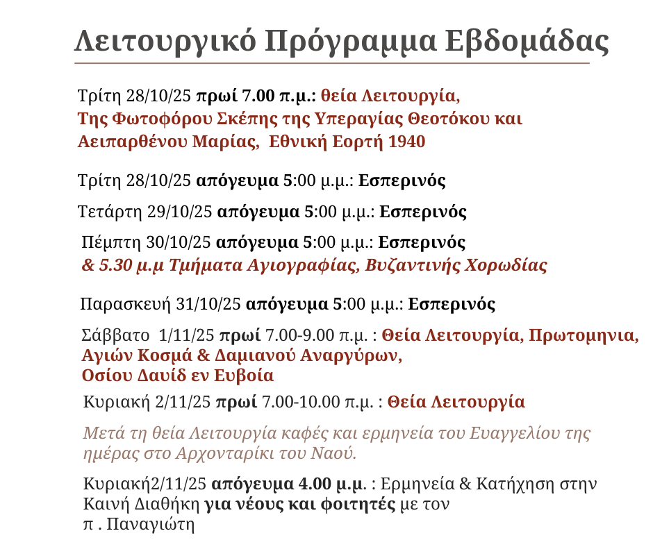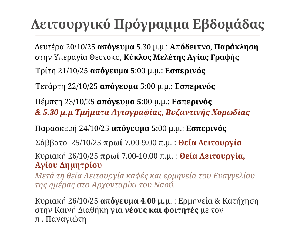 ΠρόγραμμαΠρόγραμμα Εβδομάδας 20 Οκτ ~ 26 Οκτ 2025 19 Οκτωβρίου, 2025 Πρόγραμμα Εβδομάδας, Αγιος Γεώργιος Δάσος Χαϊδαρίου