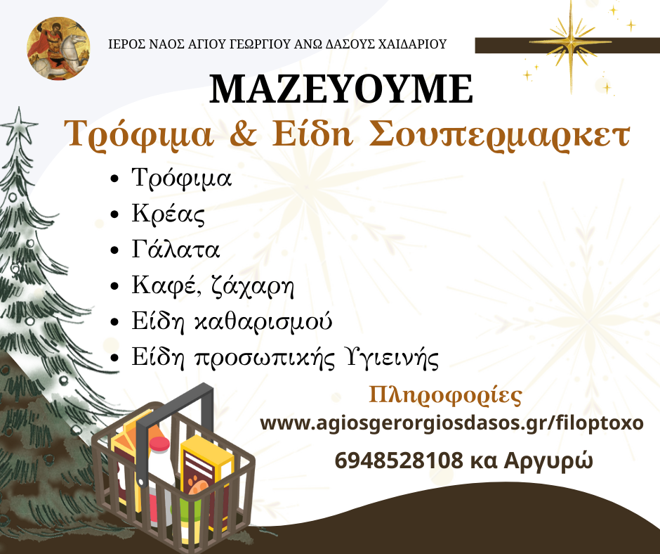 ΕπίκαιραΣυγκέντρωση Τροφίμων για τα Χρστούγεννα 3 Δεκεμβρίου, 2025 Για περισσότερες πληροφορίες κάντε κλικ εδώ >> Φιλόπτωχο